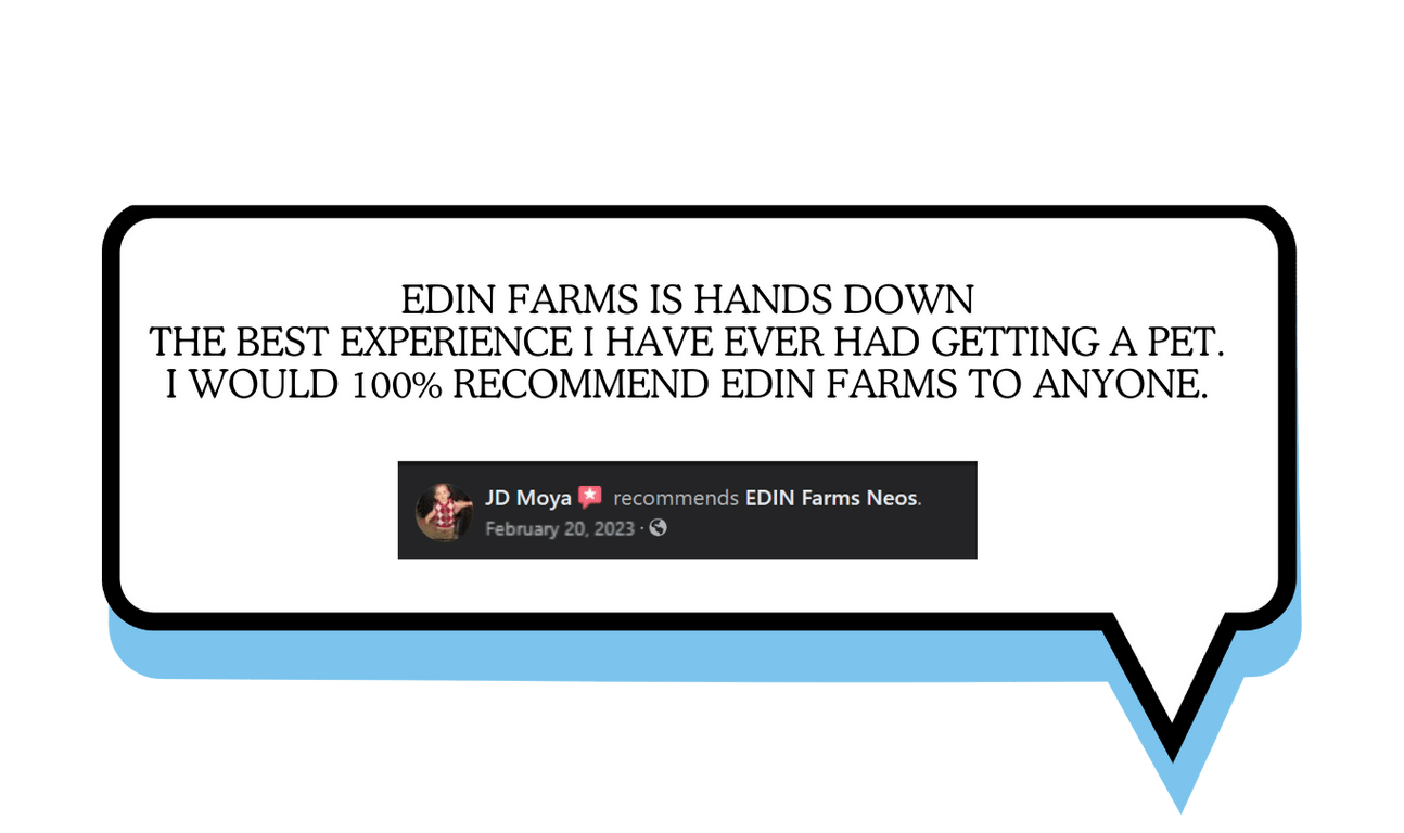 “Jessica was fabulous to work with and our pup is perfect!! She answered loads of questions and still does even weeks after we got him home! EDIN Farms really cares about their neos and the families that take them home.”